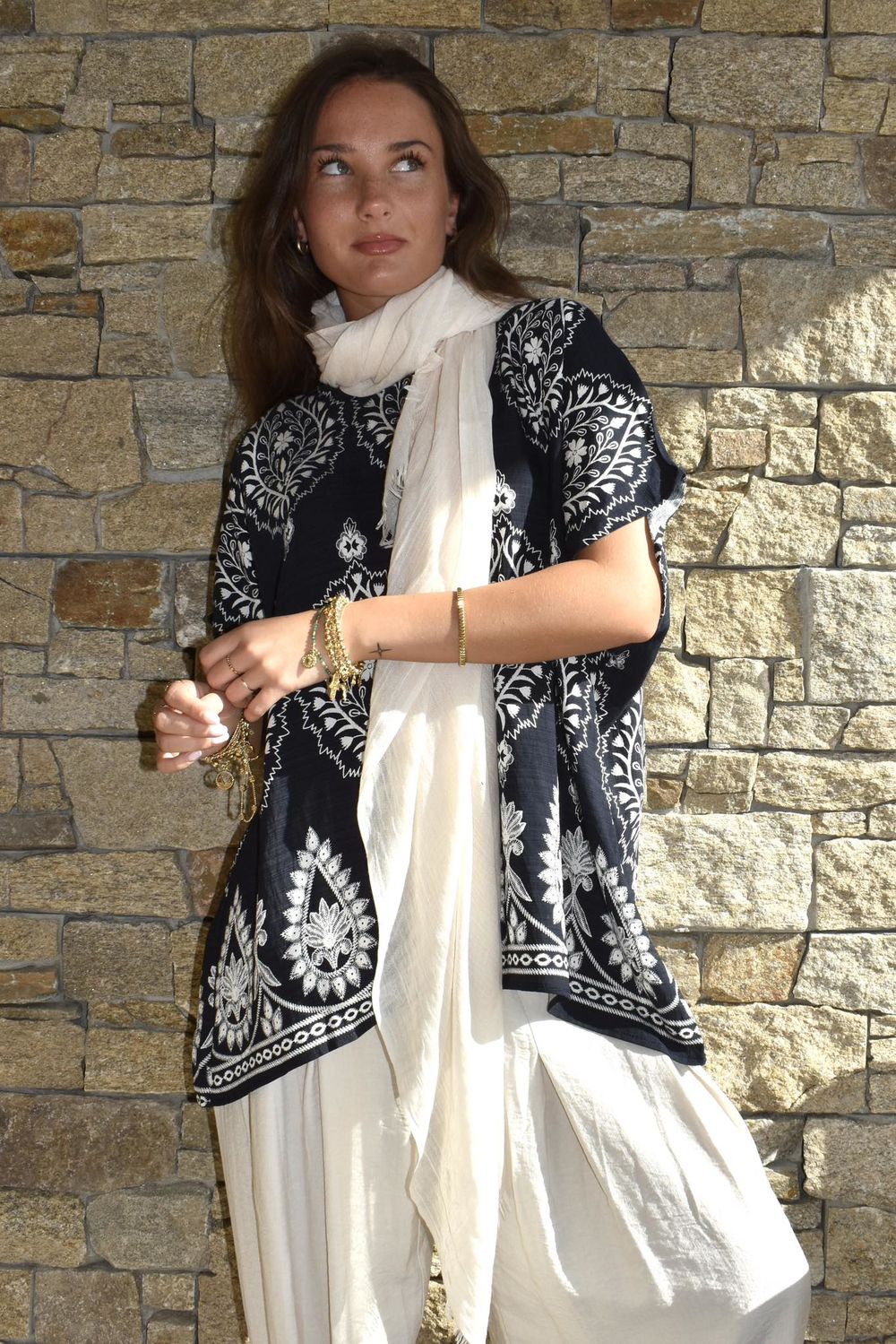 Elevate your everyday wardrobe with this one-size women’s box top in a navy blue tone. Combining relaxed comfort with subtle luxury, it’s perfect for effortless style with a modern edge. The top features a Moroccan-inspired print, adding a artisanal charm to a classic silhouette. Cut in a relaxed boxy silhouette with a round neckline, this top pairs beautifully with barrel leg trousers, wide-leg pants, or tailored bottoms, making it an ideal choice for work, weekend, or chic layering. Short drop-shoulder sleeves soften the boxy shape, creating a flattering, easy-going fit that moves with you. Lightweight and versatile, it’s perfect for pairing with statement trousers or layering under jackets and cardigans for added texture.